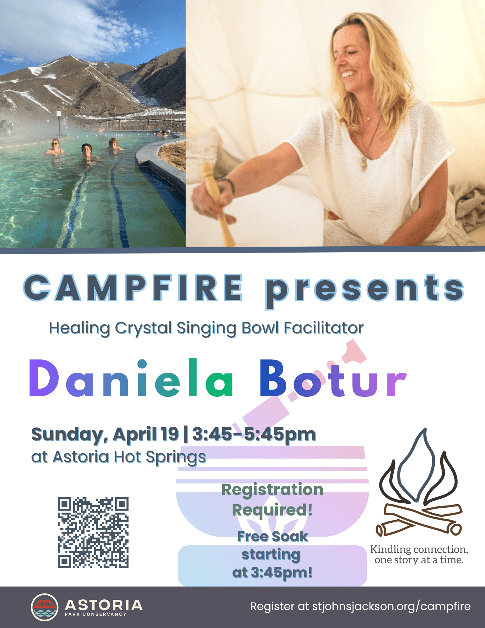 CAMPFIRE Presents: Sound Healing + with Daniela Botur April 19 | 3:45 pm - 5:45 pm at Astoria HotSprings FREE AND OPEN TO THE PUBLIC (16+) REGISTRATION REQUIRED Harness the healing power...